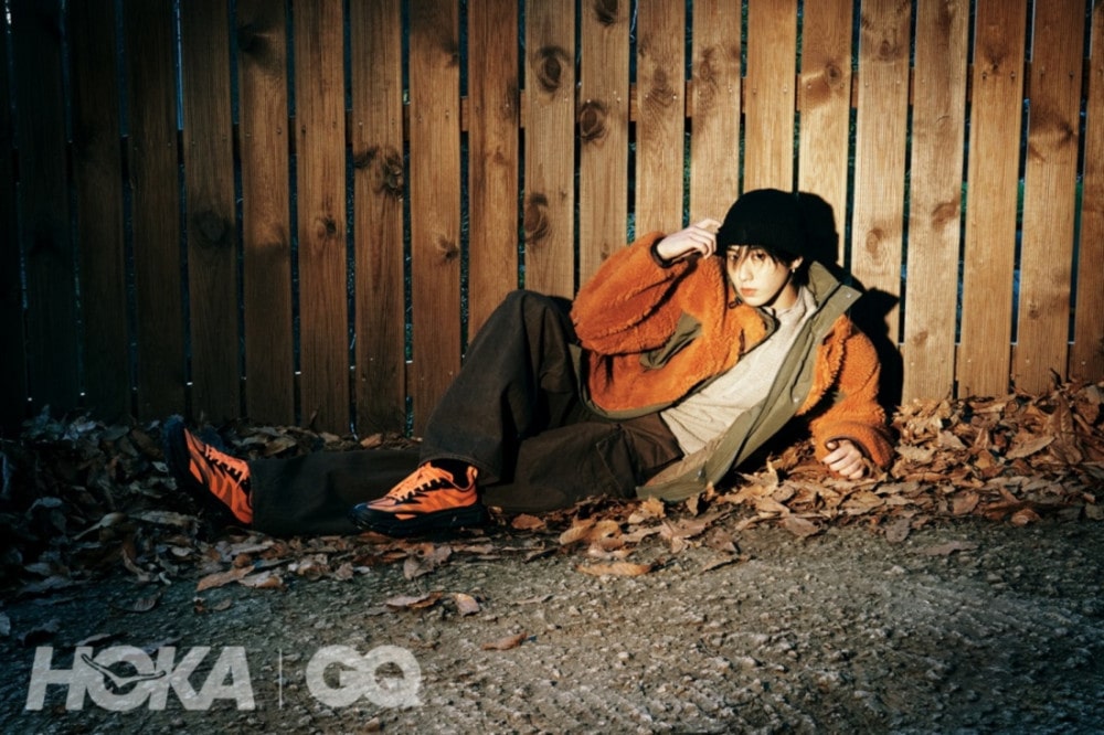 In the pictorial, HAN sports a fashionable style wearing HOKA's Mafate Speed 2, Mafate Speed 4 LITE, and Speedgoat 2. The iconic silhouette of HOKA, combining functionality and style, enhances HAN's stylish presence by blending with his sensuous look.
