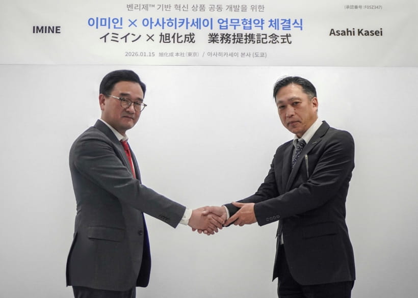 The signing ceremony took place at Asahi Kasei's headquarters in Tokyo, with Imiin CEO Park Jeong-wan and Asahi Kasei's Bemliese Sales Department Manager Morishima attending as representatives.