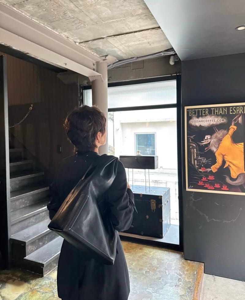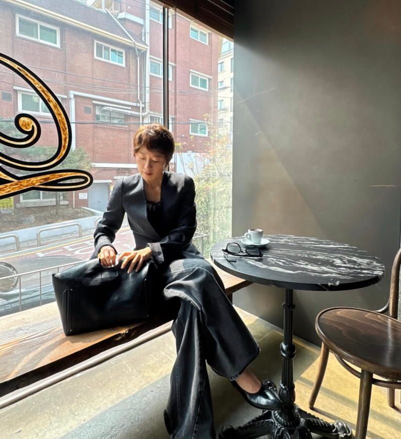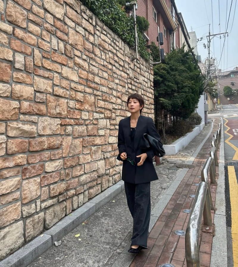She paired a sleek, collarless black jacket with wide-fit black denim pants, creating a look that’s polished yet relaxed. In particular, the contrast between the top’s slim silhouette and the volume of the bottoms further accentuated her figure.